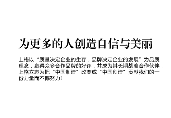 • 上格一路走來,以“締造時(shí)尚集團(tuán),使公司受人尊敬,令人向往;為客戶提升價(jià)值,創(chuàng)造成功;讓員工提高生活品質(zhì),實(shí)現(xiàn)自我價(jià)值”作為我們的目標(biāo),“為更多的創(chuàng)造自信與美麗” 作為我們的使命,立志為把“中國(guó)制造” 改變成“中國(guó)創(chuàng)造”貢獻(xiàn)我們的一份力量而不懈努力!